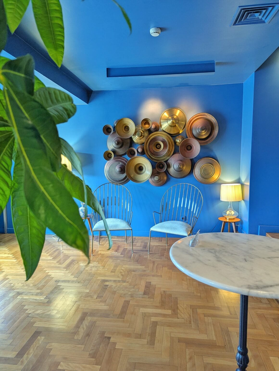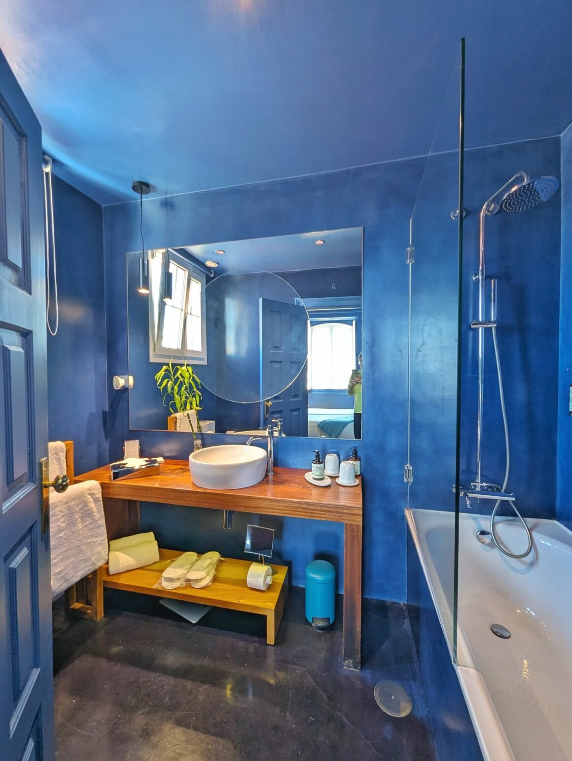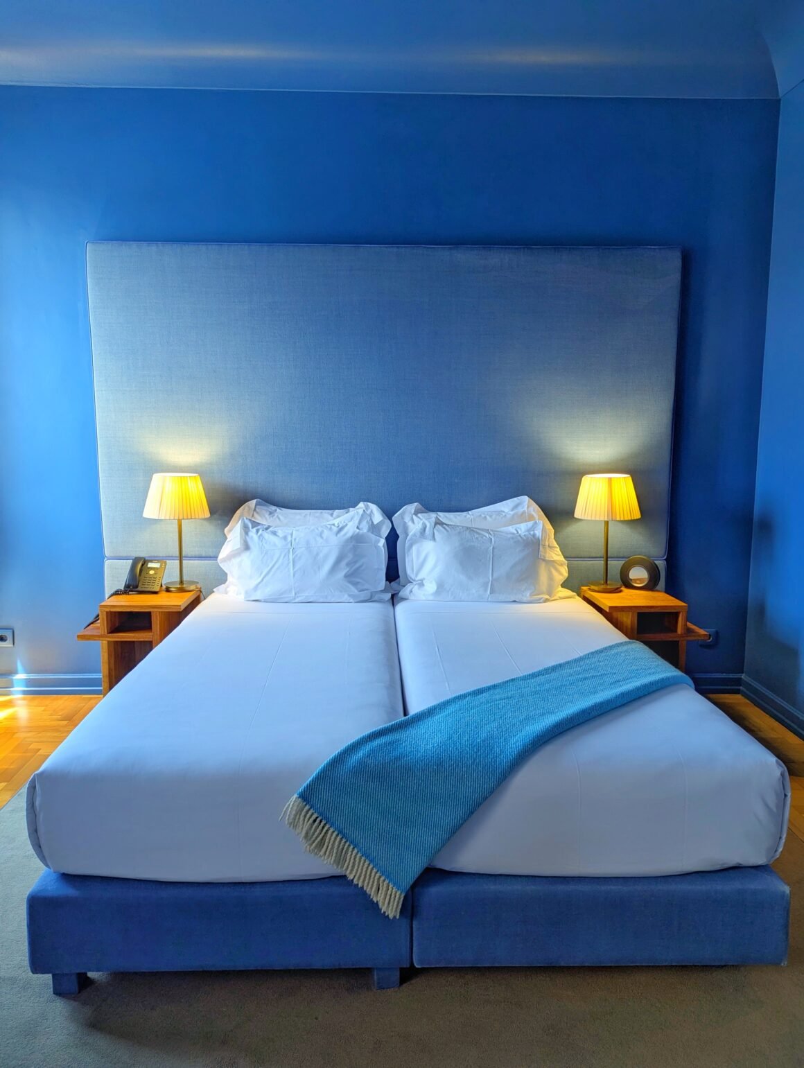 Having fallen in love with their vibrant interiors, I booked a deluxe sea-view room and requested my favorite — a royal blue room. I wouldn’t describe the color as royal blue; to me, it’s more cerulean.