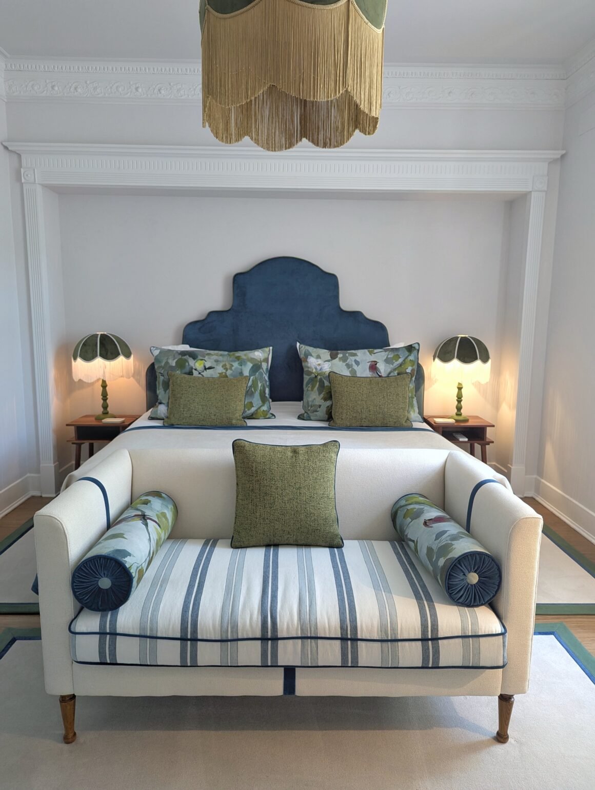 A previous iteration of the Pergola Boutique Hotel had rooms with tile-inspired wallpapers and vibrant headboards. Today, the hotel rooms are more muted in color, mostly bright white walls with a single accent wall or headboard in a pattern or colored velvet.